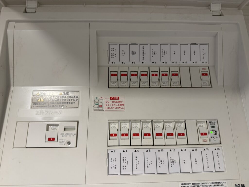我が家の分電盤です。まだ新築なので新しい今時のブレーカーですが、機能自体は古いものと一緒です。左に一つある大きなブレーカーが、主幹ブレーカです。(漏電遮断機能付き)